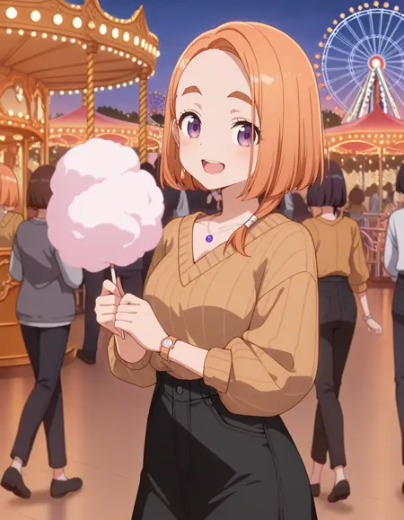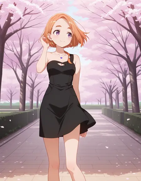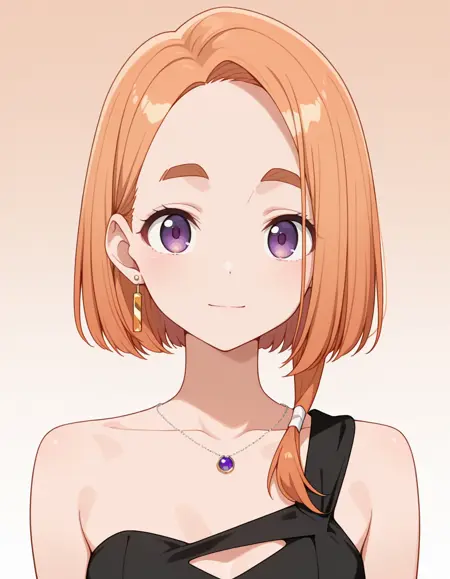 <lora:banri_shiunji-shiunji_ke_no_kodomotachi_s1-ixl-anime-soralz:1>, 반리 시운지 (시운지의 아이들), 단발, 주황색 머리, 밥컷, 귀걸이, 사이드 포니테일, 두꺼운 눈썹, 보라색 눈