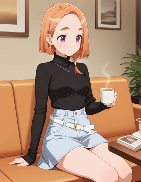 캐주얼 복장, 검은 터틀넥, 목걸이, 보석, 긴 소매, 파란색 하이웨스트 스커트, 흰색 벨트, 회색 양말, 주황색 하이힐