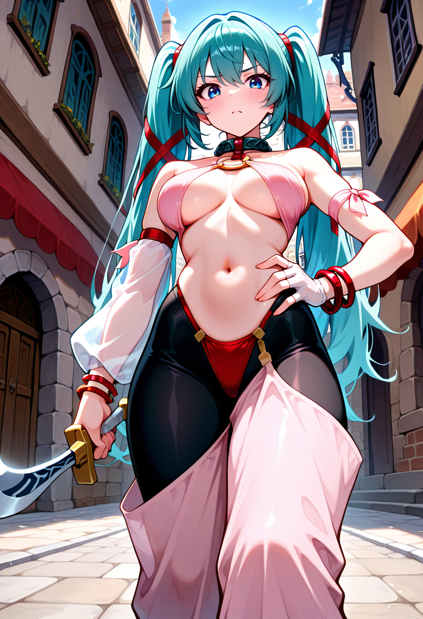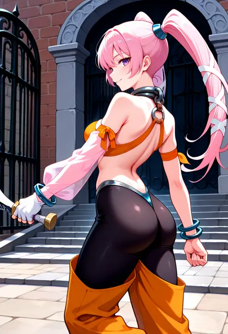 衣装: 白いリボンの髪飾り、メタルのOリングネックレス、オレンジ色のビキニトップ、片側だけの袖、単一の袖、ピンク色の透明な袖、オレンジ色の腕リボン、青いメタルブレスレット、ダンサーグローブ、片手グローブ、白いグローブ、指なしグローブ、メタルのトング、黒いレギンス、ダンスパンツ、ゆとりのあるパンツ、オレンジ色のパンツ、ヒップベンテッド、濃い青色の靴、ダンスシューズ、尖った靴、ダンスアンクレット