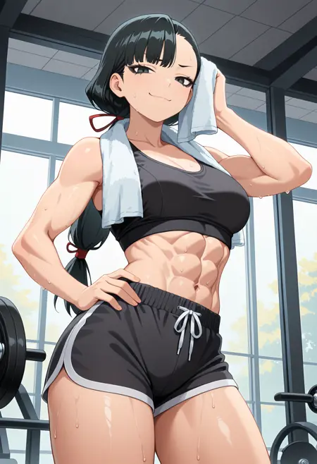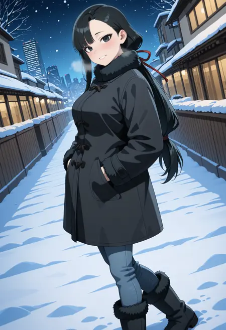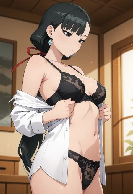 KJObenichidori, long hair, black hair, black eyes, asymmetrical bangs, hair behind ear, low tied hair, black eyeliner,