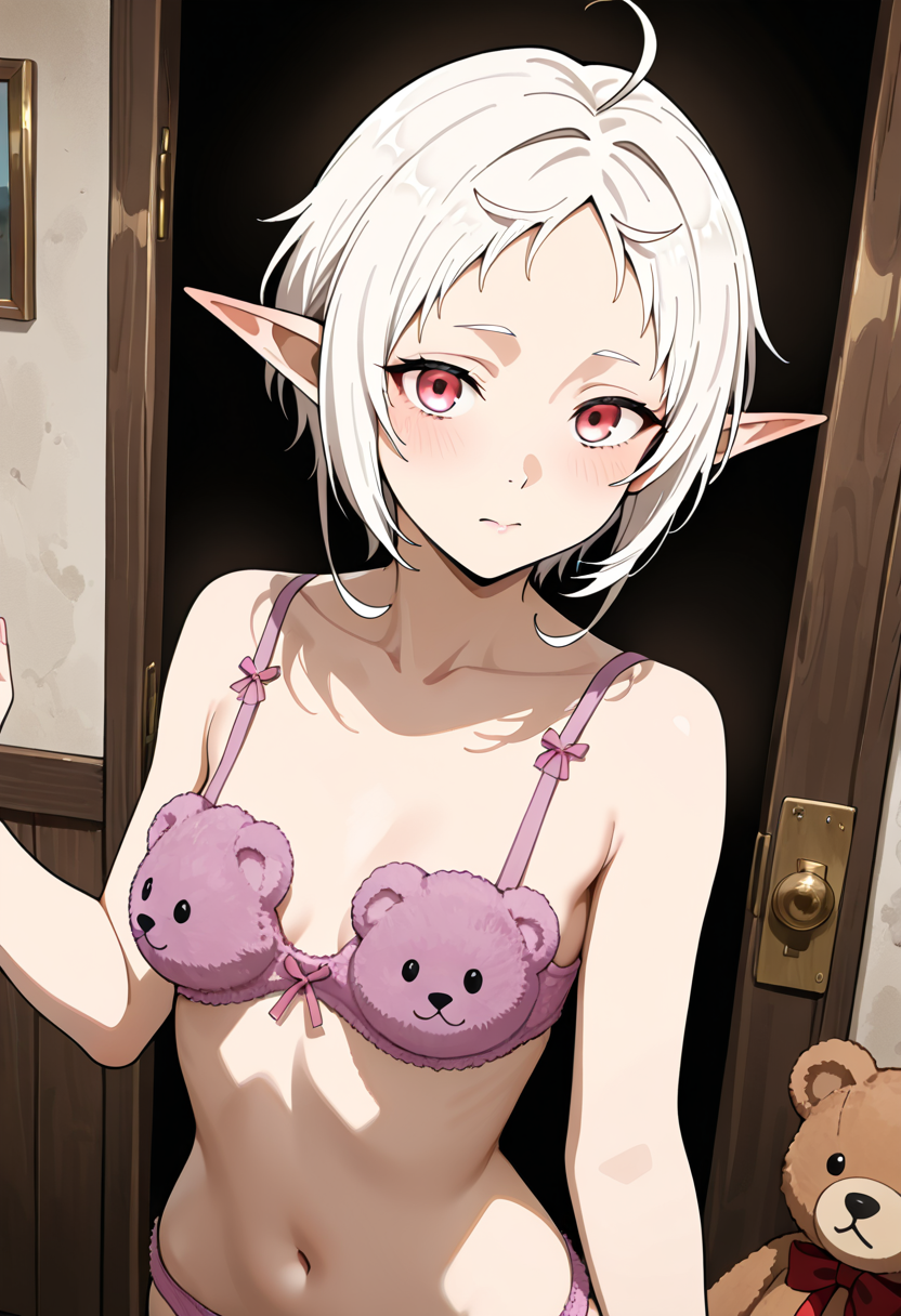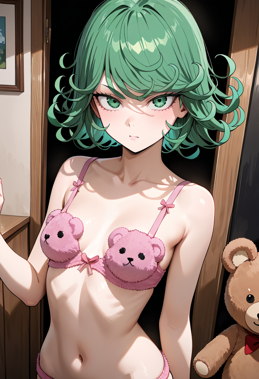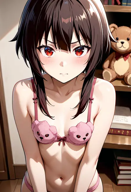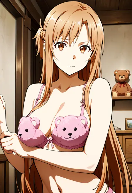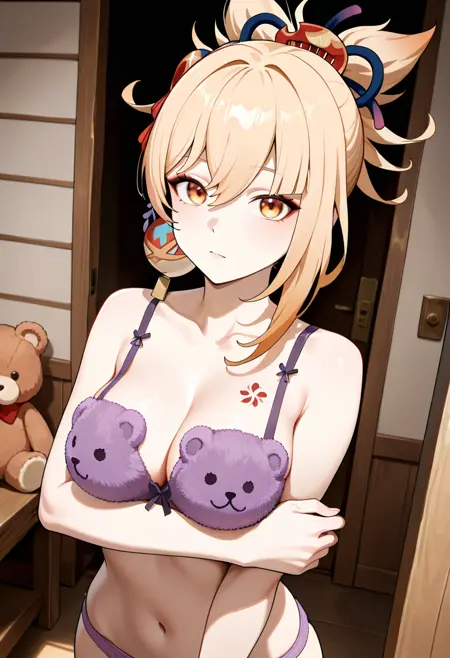 masterpiece,best quality,amazing quality,very aesthetic,absurdres,ultra detailed face,ultra detailed eyes,masterpiece, absurdres, <lora:TeddyLingerie_Illustrious_v1:0.8>,teddylingerie, 1girl, solo, breasts, navel, standing, panties, upper body, bra,  lingerie, look at viewer, anime, (anime colouring:1.1) , teddy bear bra