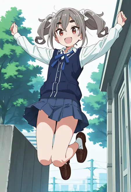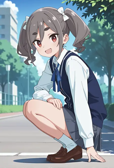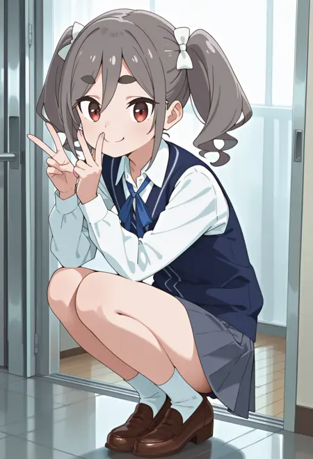 kiriyamaan-default,red eyes,thick eyebrows,grey hair,twintails,hair bow,white bow,school uniform,blue ribbon,white shirt,long sleeves,blue vest, pleated skirt,white socks,loafers