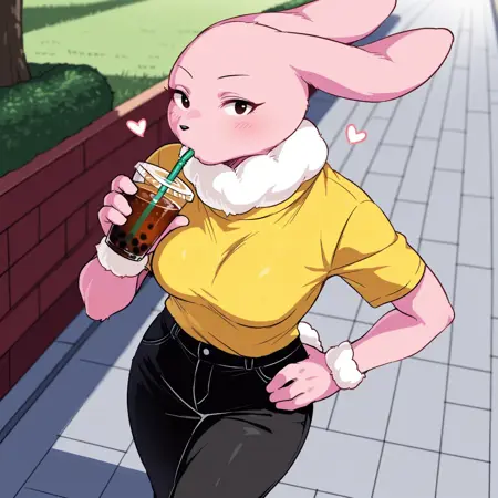 正面提示:Mochiduki,兽人,拟人化,兔子,兔形动物,黑色眉毛,黑色鼻子,细眉毛,黑色眼睛,粉色皮肤,白色颈毛,白色手腕毛,白色脚踝毛,白色兔尾,中等胸部