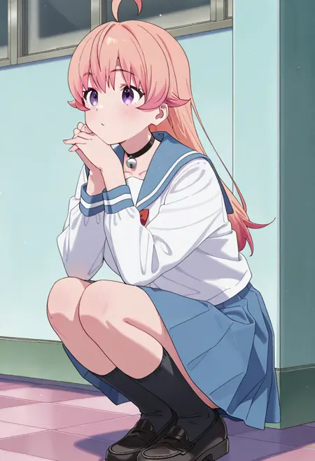 wakatsukiniko-schooluniform,purple eyes,pink hair,long hair,ahoge,neck bell,black choker,school uniform,blue sailor collar,white shirt, long sleeves,blue skirt,black socks,loafers