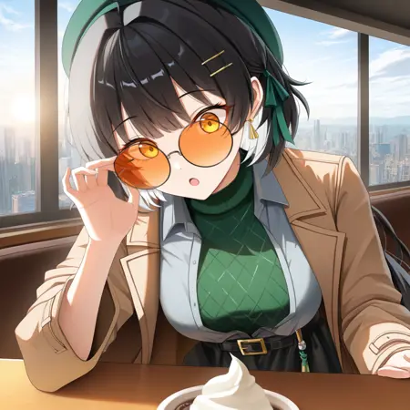 RovFem,Fol002,Rvf_Cas,黑发,多色发,黄眼,低马尾,内层彩色发,橄榄绿头饰,帽子,圆形眼镜,橙色镜片眼镜,眼镜,金耳环,圆形图案,绿色毛衣,高领毛衣,绿色流苏,灰色衬衫,敞开式衬衫,叠穿服装,黑色腰带,腰带扣,浅棕色外套,敞开式外套,衬衫塞入,长裙,黑色裙子,宽袖,