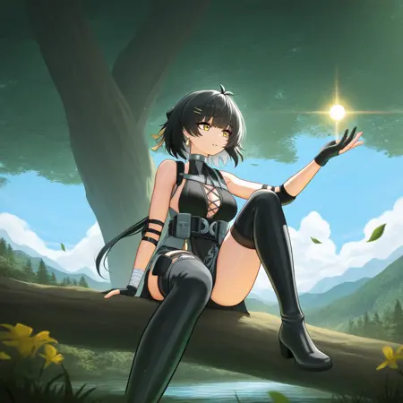 RovFem,Fol001,Rvf_Def,黑发,多色发,黄眼,低马尾,内层彩色发,黑色短裤,超短裤,灰色裙子,骨盆帘,胸膛开叉,胸部露肤,交叉系带服装,无袖连衣裙,黑色连衣裙,胸下部,灰色背包,肩带,金耳环,金色流苏,黄色丝带,腰带包,绷带手腕,灰色镶边,发夹,肘部护垫,颈带,长丝带,灰色衬衫,发丝带,黑色腰带,裙内衬衣,吊带上衣,灰色项圈,黑色丝带,黑色过膝袜,靴内过膝袜,大腿靴,黑色鞋履,大腿包,部分露指手套,黑色手套,