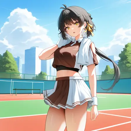 RovFem,Fol003,Rvf_Tns,黑发,多色发,黄眼,低马尾,内层彩色发,网球服,双色衬衫,白色衬衫,棕色衬衫,短款衬衫,Polo衫,肩部开叉,内衬,短袖,不对称袖子,白色腕带,腕带,双色裙子,网球裙,白色裙子,棕色裙子,金耳环,发夹,黄色丝带,发丝带,