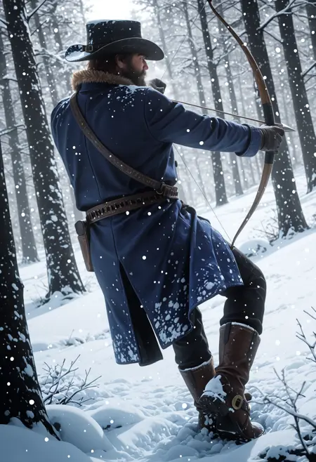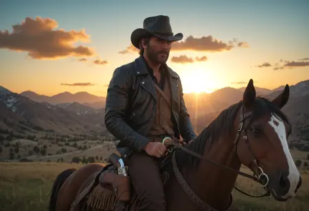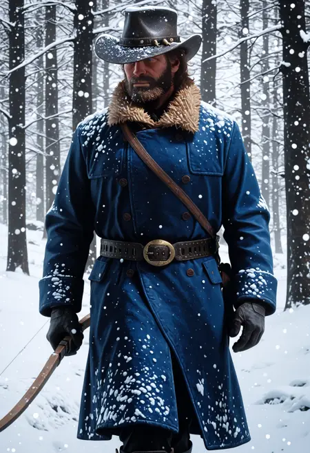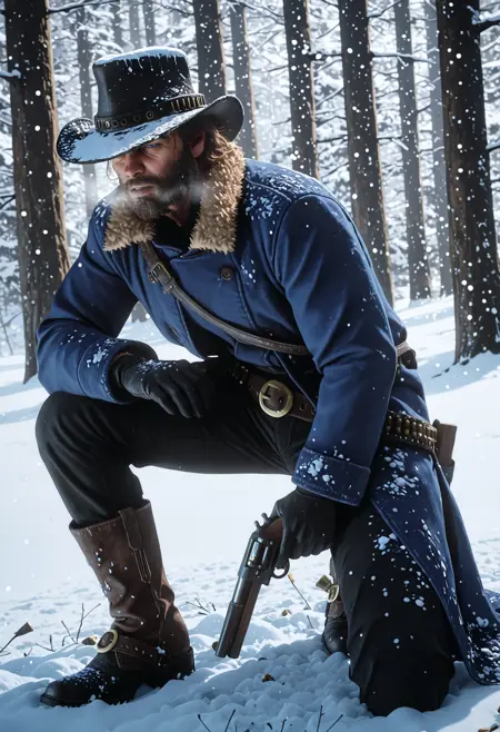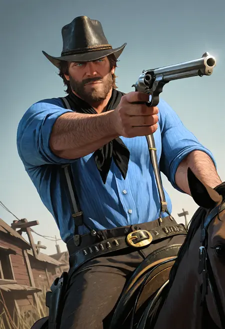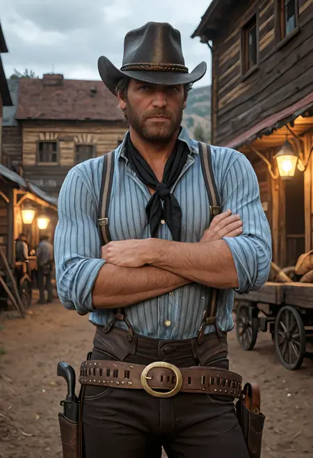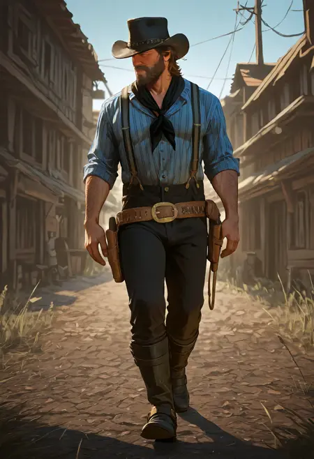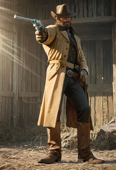 I did not train on specific outfit since there is a lot of clothing in the game, you may want to put something like "cowboy hat, coat, belt, boots" in the prompt. However there are some set of outfits from game you may want to use.