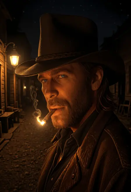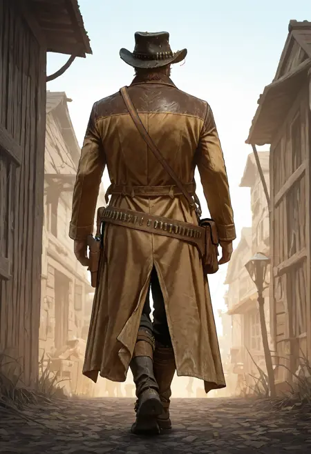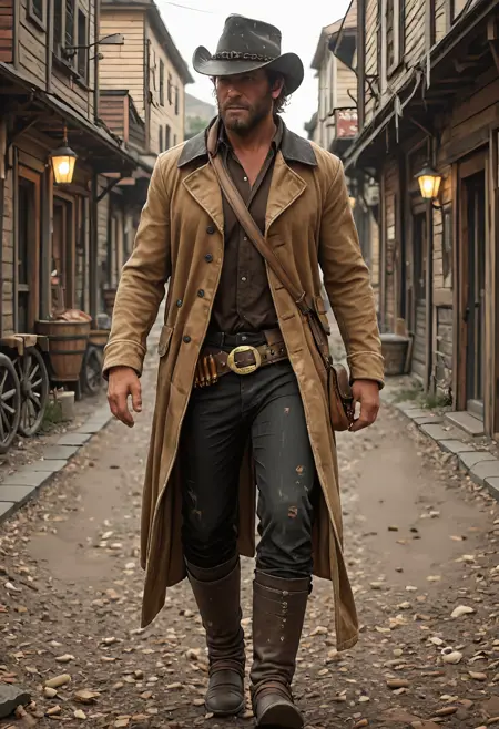 dark cowboy hat, distressed hat, brown long coat, dark shirt, dark pants, belt, large buckle, bullet loops, holster, wrapped boots, satchel