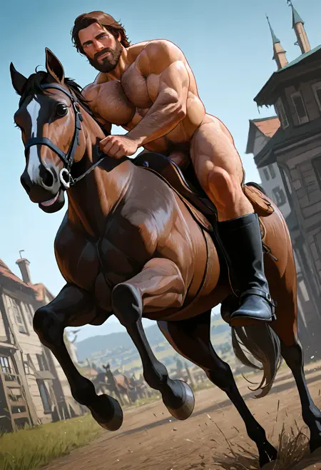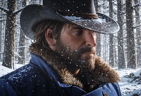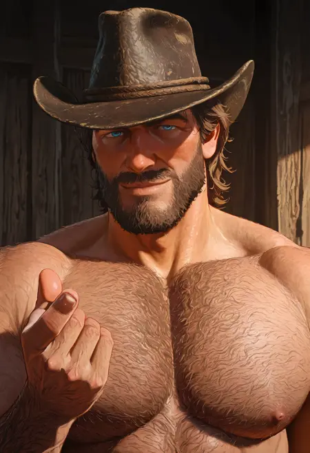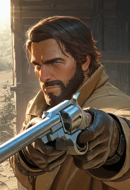 rdr2arthurm0rgan, mature male, messy medium brown hair, blue eyes, scruffy beard
