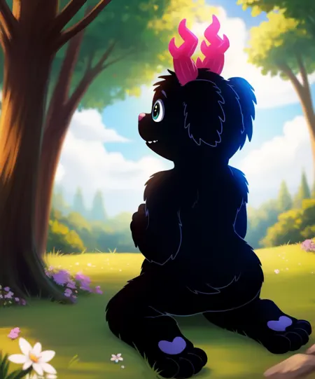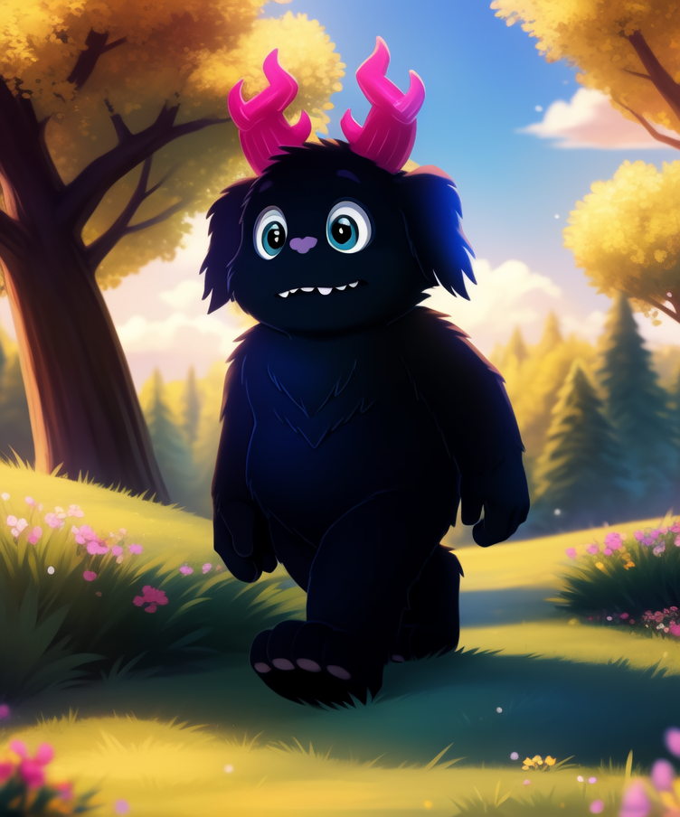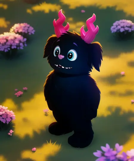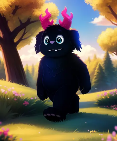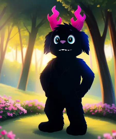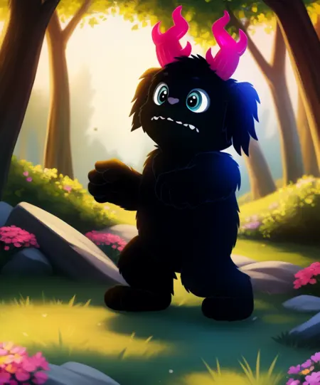 FredTulipop1, monster, black fur, blue eyes, pink horns, tail, chibi,