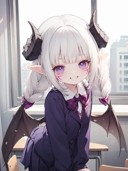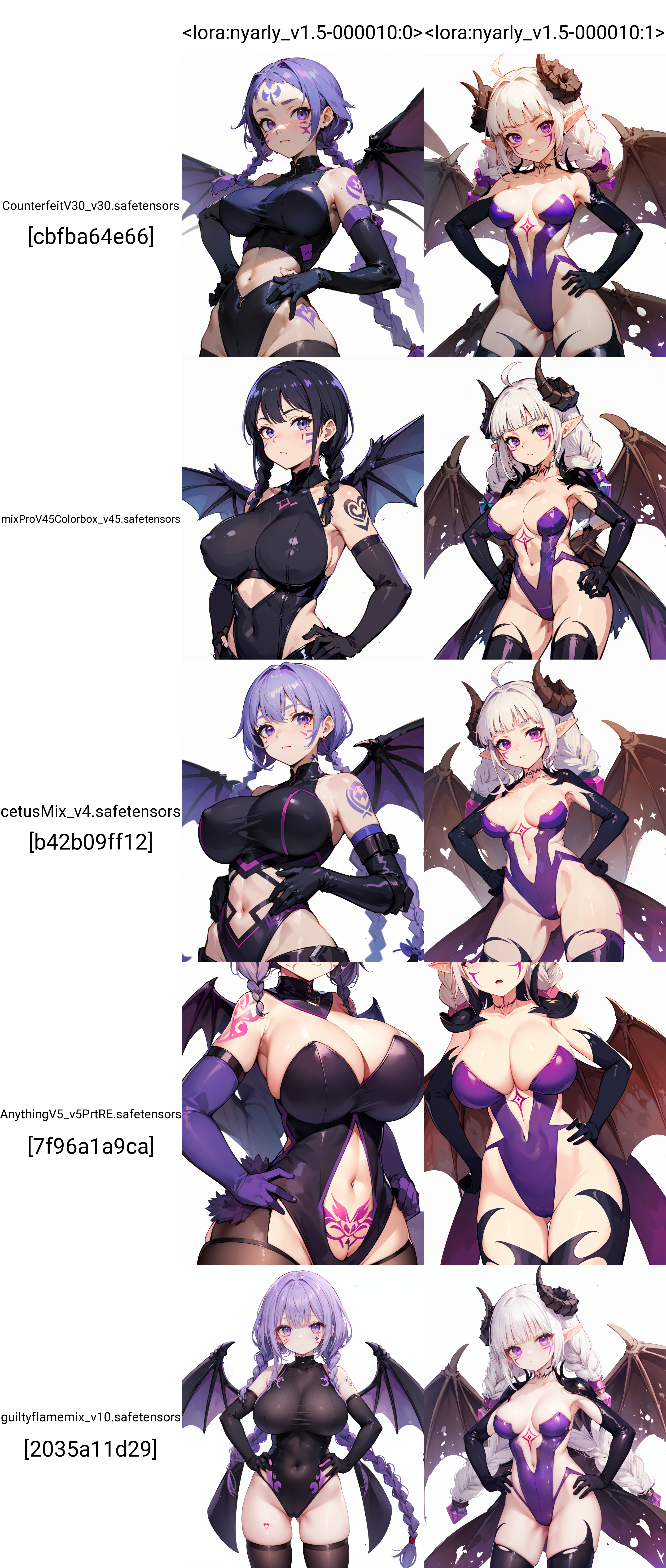 공식 의상 트리거 키워드: purple leotard, black thighhighs, jewelry, elbow gloves, low bat wings, long dress, midriff tattoo, black collar, spiked bracelet