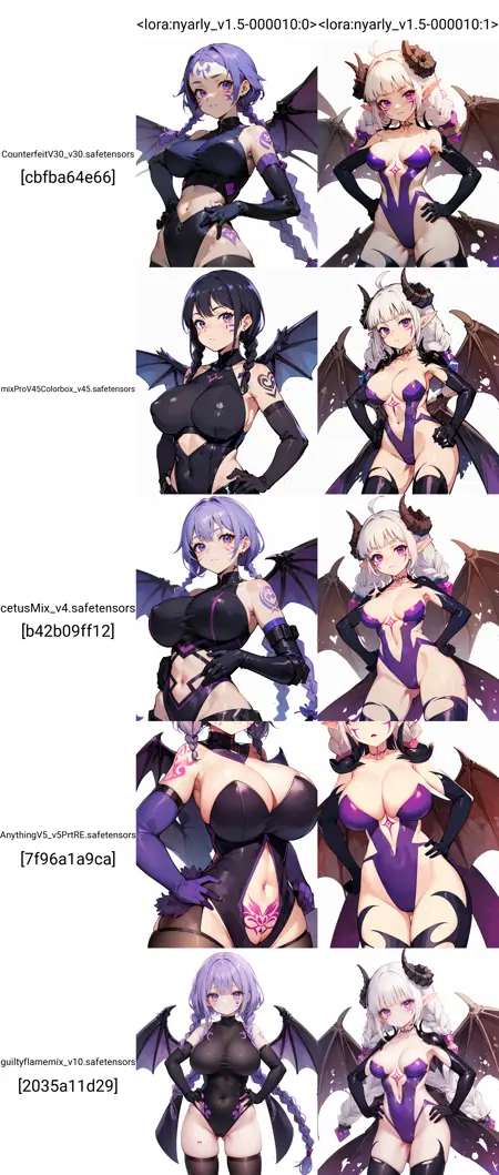 官方服装触发词:purple leotard,black thighhighs, jewelry, elbow gloves,low bat wings,long dress,midriff tattoo,black collar,spiked bracelet