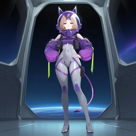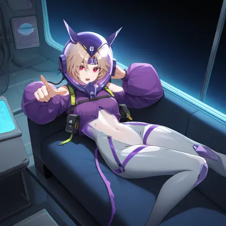 ShiroTof, Shr_Awk, red eyes, light brown hair, short hair, space helmet, purple headwear, see-through, shoulder cutout, bare shoulders, crop top, purple shirt, headgear, off-shoulder shirt, armored collar, pouch, chest harness, harness, headband, puffy sleeves, long sleeves, purple sleeves, magenta trim, stole, covered navel, sleeveless bodystocking, white bodystocking, grey bodysuit, sleeveless bodysuit, grey legwear, grey thigh boots, purple strap, purple thigh strap, purple tail, antenna,