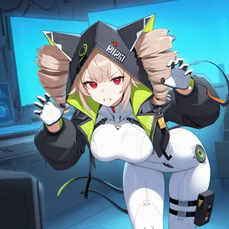 ShiroTof, Shr_Def, twin drills, red eyes, light brown hair, white bodysuit, bodysuit, zipper, white legwear, two-sided hood, black hood, animal hood, black jacket, hooded jacket, hair through hood, cropped jacket, puffy long sleeves, turtleneck, open jacket, black sleeves, two-sided gloves, white gloves, thigh boots, black tail, white footwear, thigh pouch, black thigh strap,