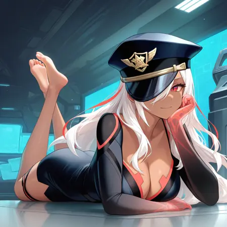 TamaSom, 白发, 长发, 红眼, 发色渐变, 红发, 帽子遮住一只眼睛, 透明身体, 深色皮肤女性, 深色皮肤, 暴露胸部, 短裙, 黑色裙子, 黑色袖子, 交叉肩带, 多条大腿带, 警帽, 黑色头饰, 红色镶边,