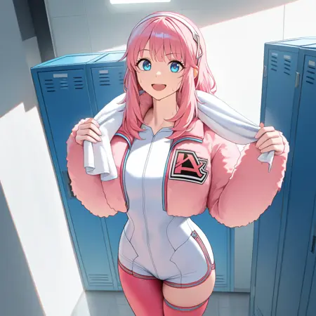 IrisSom, Irs_Grw, 분홍색 머리, 파란 눈, 어깨에 걸친 머리카락, 긴 머리, 유니타드, 흰 유니타드, 흰 바디수트, 비대칭 다리 복장, 불균형한 다리 복장, 분홍 장식, 한쪽 다리 스타킹, 분홍 스타킹, 한쪽 허벅지 스타킹, 분홍 허벅지 스타킹, 크롭 재킷, 털 재킷, 연한 분홍 재킷, 털 소매, 열린 재킷, 문자 프린트, 손목보다 짧은 소매, 흰 헤어밴드, 흰 신발, 발목 부츠,