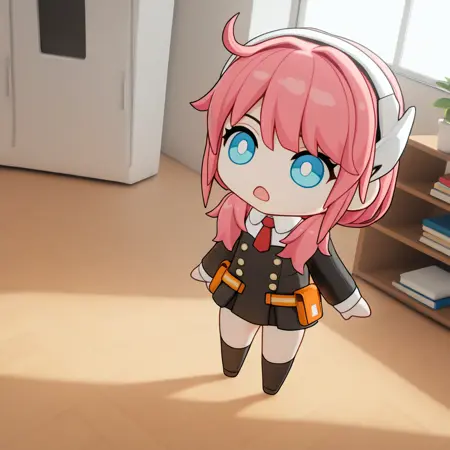 IrisSom, Irs_Sch, 분홍색 머리, 파란 눈, 트윈테일, 어깨에 걸친 머리카락, 학교 유니폼, 짧은 드레스, 검은 드레스, 더블 버튼, 주황색 벨트, 벨트 주머니, 긴 소매, 검은 소매, 흰 소매 cuffs, 칼라 셔츠, 흰 셔츠, 빨간 넥타이, 헤드셋, 검은 허벅지 스타킹,