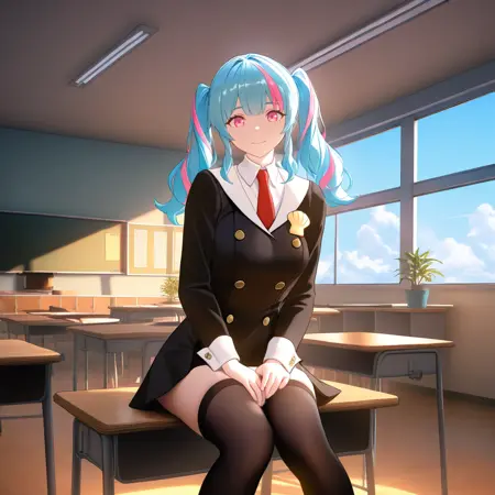 AmameSom, Amd_Sch, pink eyes, blue hair, twintails, pink streaks, streaked hair, black dress, school uniform, short dress, double-breasted, shell ornament, white shirt, dress shirt, red necktie, long sleeves, black sleeves, white sleeve cuffs, black thighhighs,