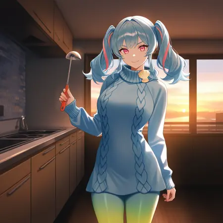 AmameSom, Amd_Cas, blue hair, twintails, streaked hair, pink streaks, blue dress, sweater dress, turtleneck sweater, long sleeves, blue sleeves, gradient pantyhose, green pantyhose, shell ornament,