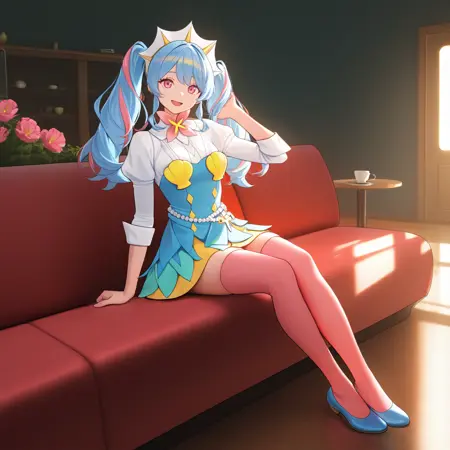 AmameSom, Amd_Mrm, blue hair, pink eyes, twintails, pink streaks, streaked hair, pink streaks, tiara, headband, shell bikini, yellow bikini, bikini over clothes, light blue dress, sleeveless dress, shirt under dress, light blue skirt, multicolored dress, yellow skirt, beads, collared shirt, white shirt, bead belt, fish ornament, pink flower, neck flower, pink thighhighs, juliet sleeves, white sleeves, rolled up sleeves, sleeves past elbows, blue shoes,