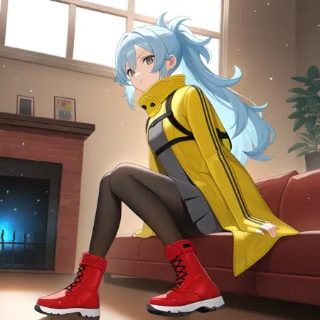 MizukiAiSom, Miz_yng, 긴 머리, 연한 파란색 머리, 꼬리머리, 회색 눈, 주름 드레스, 대안 검은 드레스, 배낭, 가슴 허리대, 노란 코트, 열린 코트, 높은 칼라, 손목을 넘는 소매, 노란 소매, 검은 팬티스타킹, 빨간 신발, 부츠,