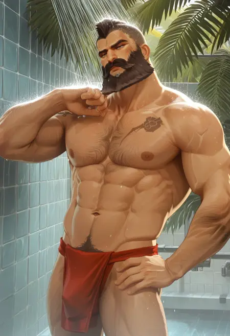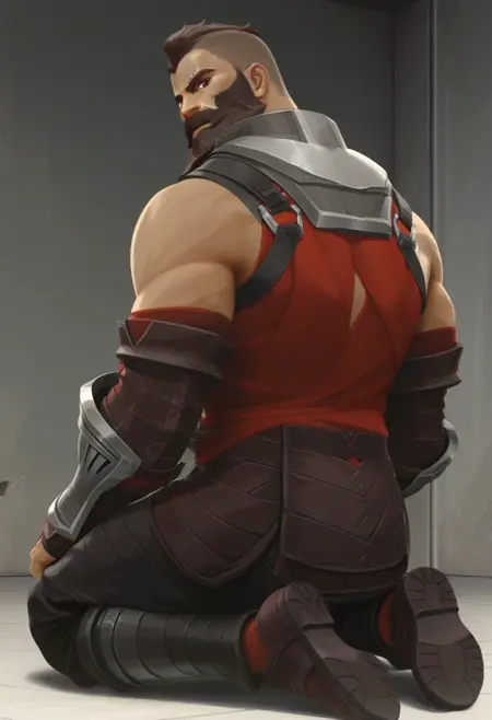 rcts_arcn, 1boy, solo, beard, facial hair, muscular, short hair, armor, mustache, bare shoulders