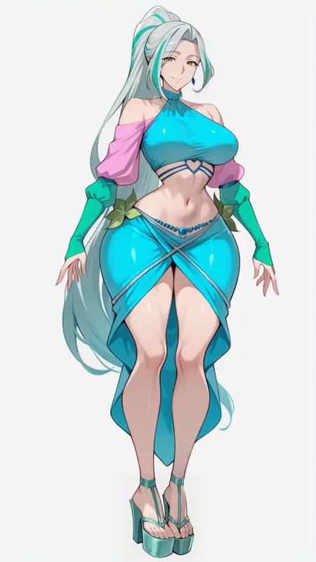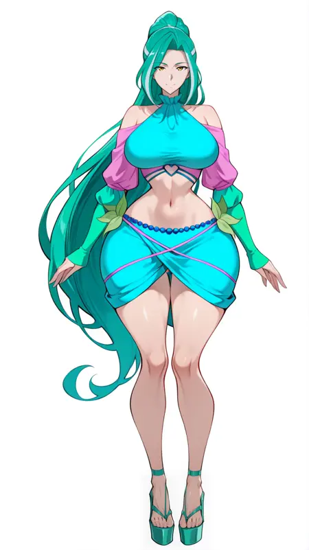 Tags: frilled collar, bare shoulders, shoulder cutout, arm warmers, crop top, halter shirt, blue halter shirt, heart cord halter shirt, blue heart cord, hot pink sleeves, pink sleeves, arm warmers, green arm warmers, leaf arm-warmers (green), ribbon, wrist ribbon, leaf, midriff, navel, beads, 3-leaf skirt, wrinkled fabric, skirt, blue skirt, sophix footwear, light green high heels, mule heels, sandals, fluorescent green footwear, green footwear, platform heels, block heels, toes, feet,