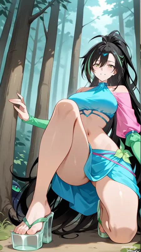 タグ: フリルカラー、肩出し、肩の切り替え、アームウォーマー、ショートトップ、ハーネスシャツ、青いハーネスシャツ、ハート型コードハーネスシャツ、青いハートコード、ホットピンクの袖、ピンクの袖、アームウォーマー、緑のアームウォーマー、葉柄アームウォーマー(緑)、リボン、手首リボン、葉、お腹部分、へそ、ビーズ、3枚葉スカート、しわのある生地、スカート、青いスカート、ソフィックスシューズ、薄いグリーンのハイヒール、ミュールヒール、サンダル、蛍光グリーンの靴、グリーンの靴、プラットフォームヒール、ブロックヒール、つま先、足