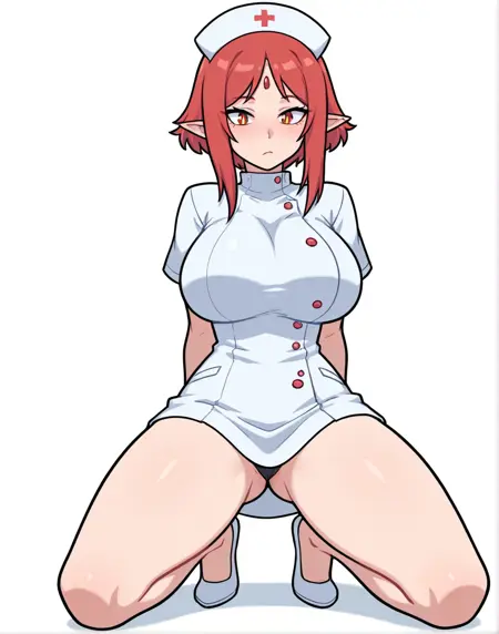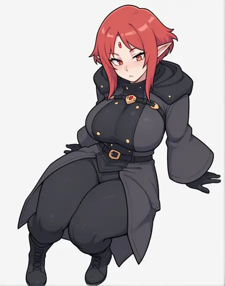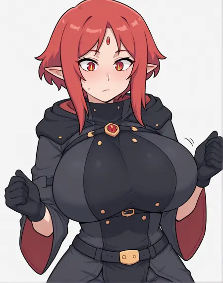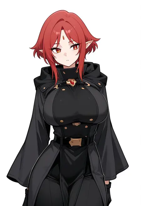 プロンプト: Wolbach-Liver020, 1girl, solo, red hair, short hair, parted bangs, red gem, red eyes, slit pupils, yellow pupils, pointy ears, bangs, short hair with long locks, large breasts, elf ears, bangs, black clothes, hood, black gloves, ornaments, wide sleeves, black pants, hood down, black belt, buttons, black tunic