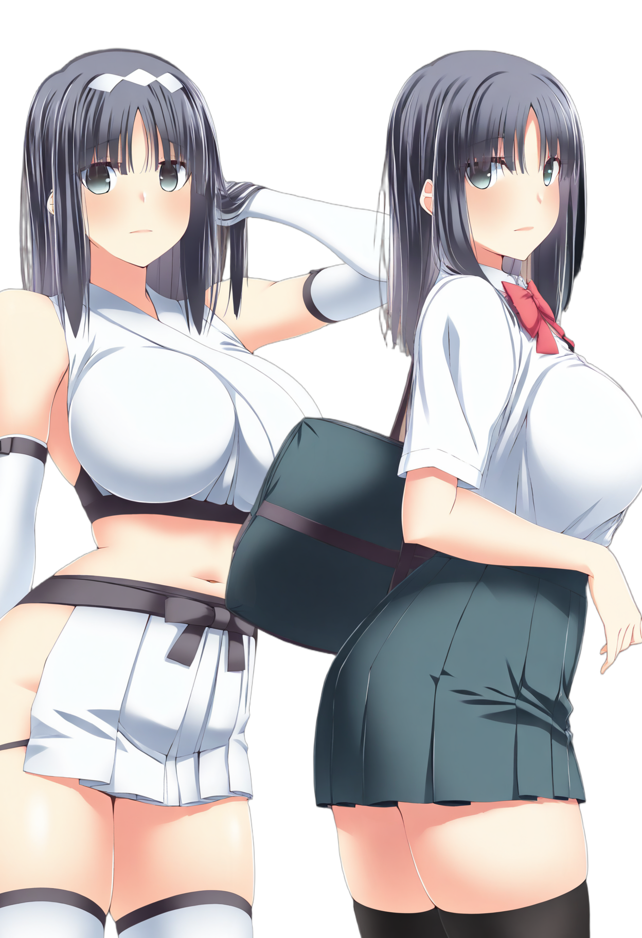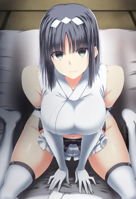 Clothing: hairband, sleeveless kimono, elbow gloves, black bow, white skirt, side slit, white thighhighs, midriff,
