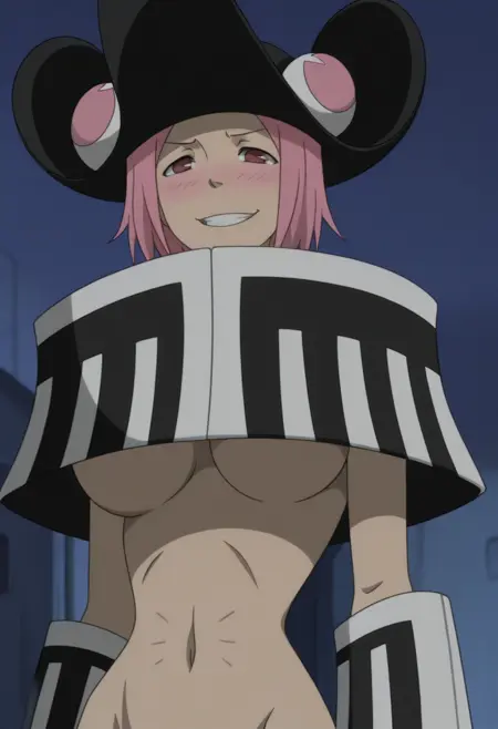 트리거 = zzmizunezz, 태그 = 분홍색 머리카락, 모자, 혼자, 1소녀, 단발, 배꼽, 분홍색 눈, 복부, 가슴, 언더부브, 큰 가슴, 미소, 애니메이션 컬러링, 이빨, 갈색 눈,