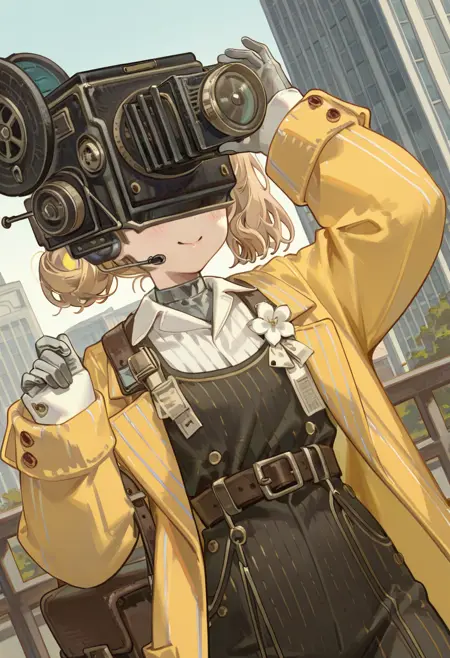 큰머리거북이, 흰 셔츠, 짧은 머리, 점프수트, 금발 머리, 안경, 사이드 페니테일, 팔소매가 손목을 넘음, 벨트, 셔츠, 기계식 팔, 오버올, 눈 없음