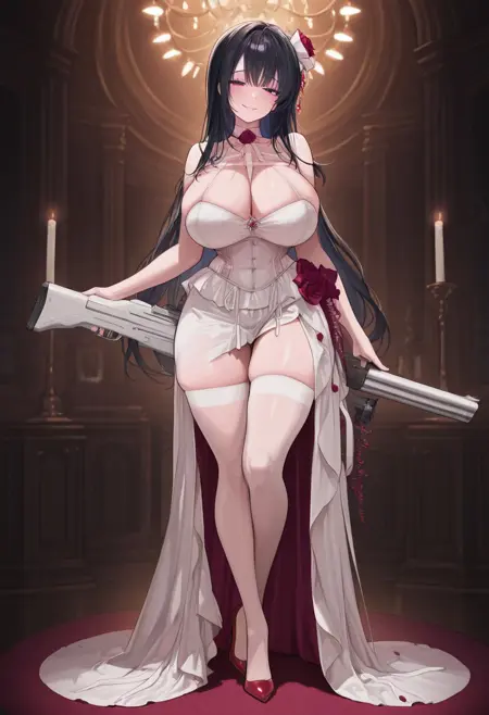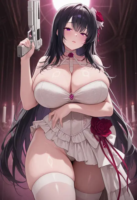 long hair, purple eyes, high heels, thighhigs, white dress, large breast, hair ornament, flower, black hair