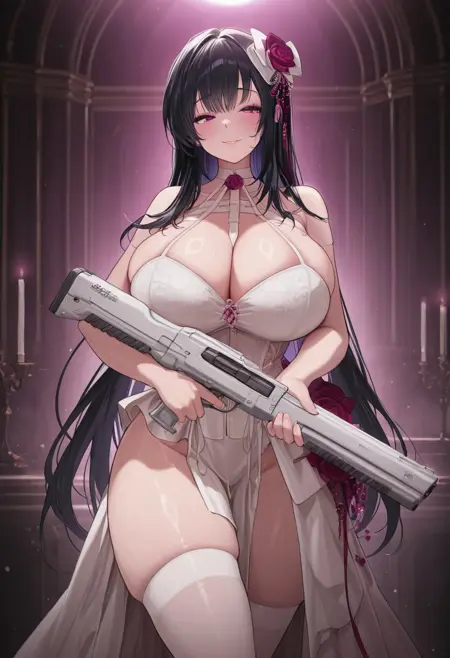 그런 다음 큰 가슴, 드레스, 꽃, 검은 머리, 긴 머리, 흰 드레스, 머리 장식, 하이힐과 같은 단어를 사용할 수 있습니다