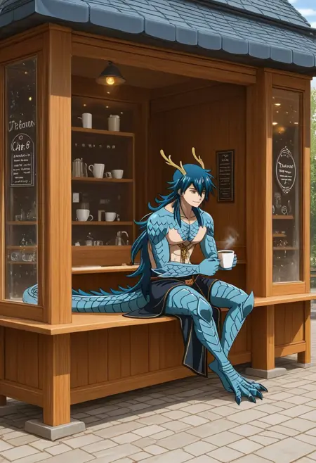 Baal, blue scales, sword, dragon tail, blue spiky hair, lightning, blue dragon legs