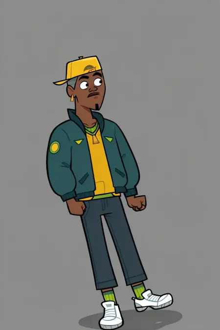 DamienTDI23, 1boy, dark skinned male, short black goatee, pencil black mustache, backwards yellow cap, gray flattop hair, dark blue-green jacket, dark olive-yellow vest, dark blue-grey pants, greenish-white tube socks with green stripes, white sneakers