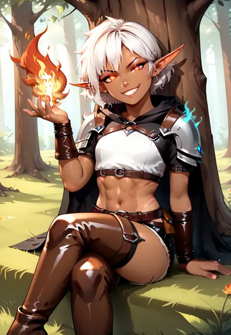 Pny Cassara, 다크 엘프, 검은 피부, 갈색 피부, 작은 엘프, 엘프 귀, 뾰족한 귀, 흰 머리, 단발, 옆머리, 앞머리, 빨간 눈, 몸에 흉터, 1girl, 솔로, 운동적인,