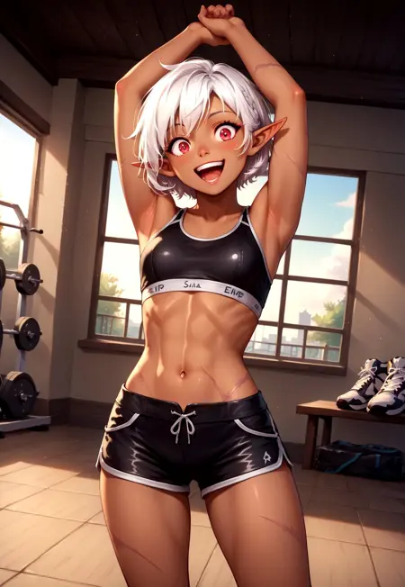 Pny Cassara, dark elf, dark skin, brown skin, petite elf, elf ears, pointy ears, white hair, short hair, sidelocks, bangs, red eyes, scars on body, 1girl, solo, athletic,