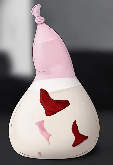 main tags: condom disposal, clothes inside condom, condom focus, tied condom, white translucent cum, red shirt floating inside condom, black bra floating inside condom, photo on condom, photo(black furry cat boy) name:"sam❤️", pink condom,