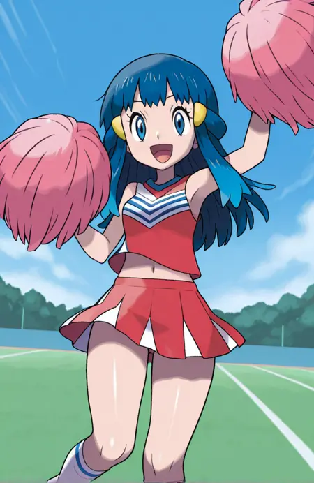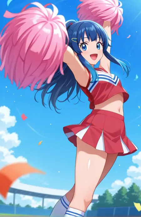 CHEERLEADER: 긴 머리, 파란 눈, 치마, 셔츠, 머리 장신구, 배꼽, 파란 머리, :d, 옆머리, 양말, 머리핀, 허리, 속눈썹, 빨간 치마, 흰 양말, 빨간 셔츠, 치어리더, 팜팜, (치어리딩), 팜팜을 들고 있는,