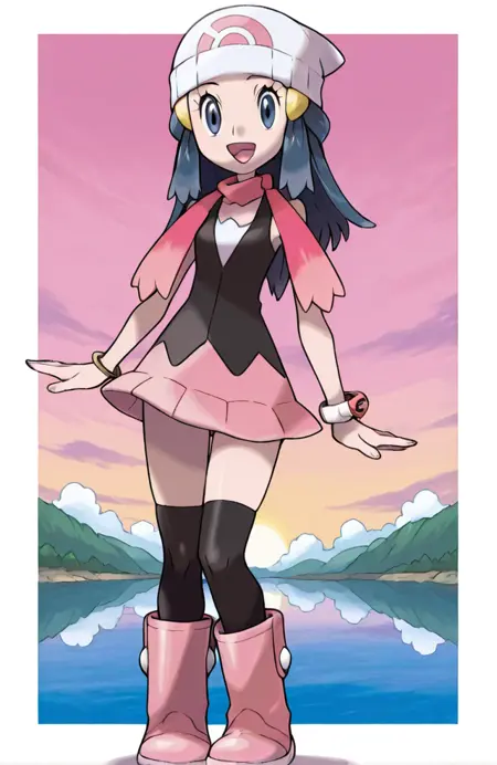 DIAMOND / PEARL: 아침, 1소녀, 단독, 모자, 분홍 신발, 치마, 부츠, 허벅지 양말, 비니, 분홍 치마, 소매 없음, 스카프, 머리 장신구, 셔츠, 흰색 머리 장식, 보석, 검은 허벅지 양말, 머리핀, 소매 없는 셔츠, 속눈썹, 검은 셔츠, 팔찌