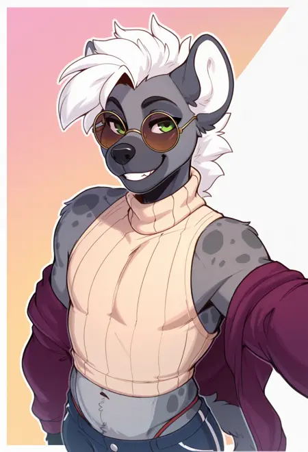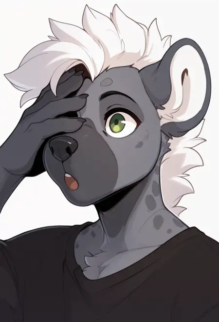 캐릭터 태그: 퓨리 남성, 동물 귀, 흰색 머리, 단발, 회색 털, 코, 녹색 눈, 동물 귀, 꼬리, 하이에나 소년