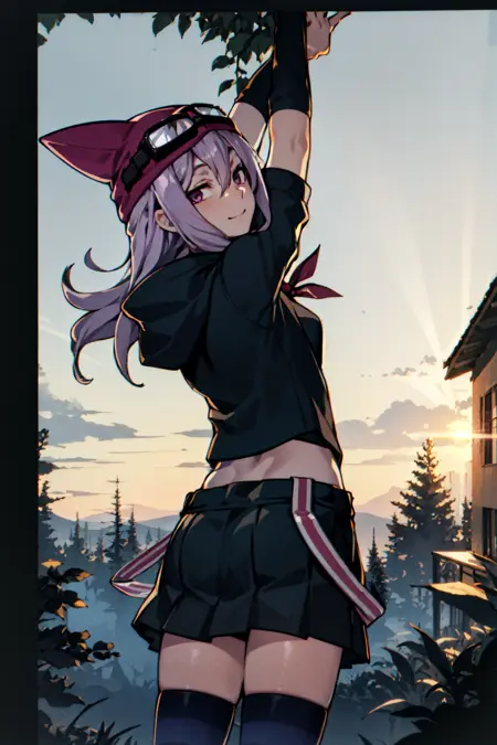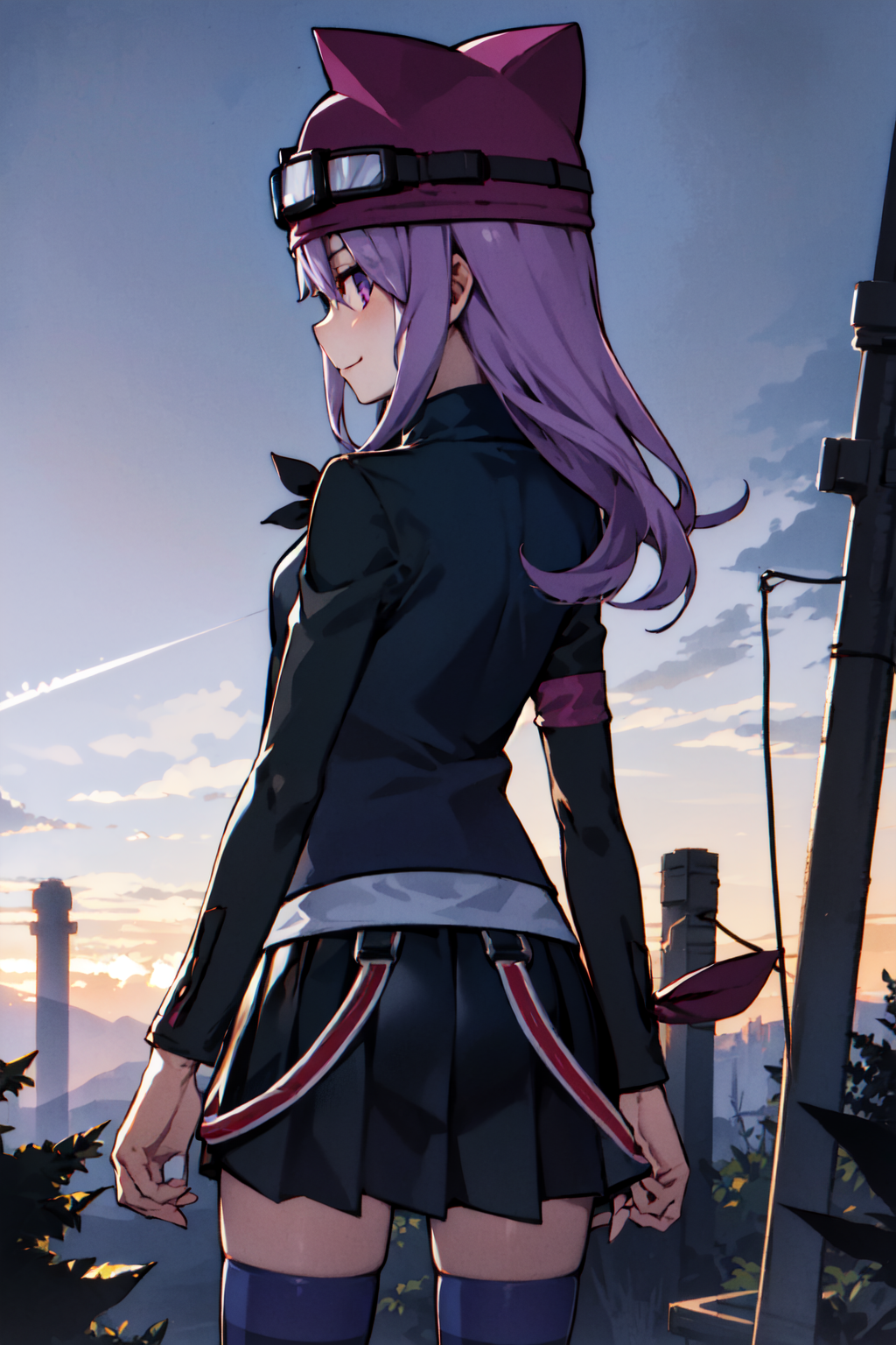 sayo, animal hat, zettai ryouiki, striped legwear, skirt, open jacket, goggles, purple hair, purple eyes, armband, necklace,