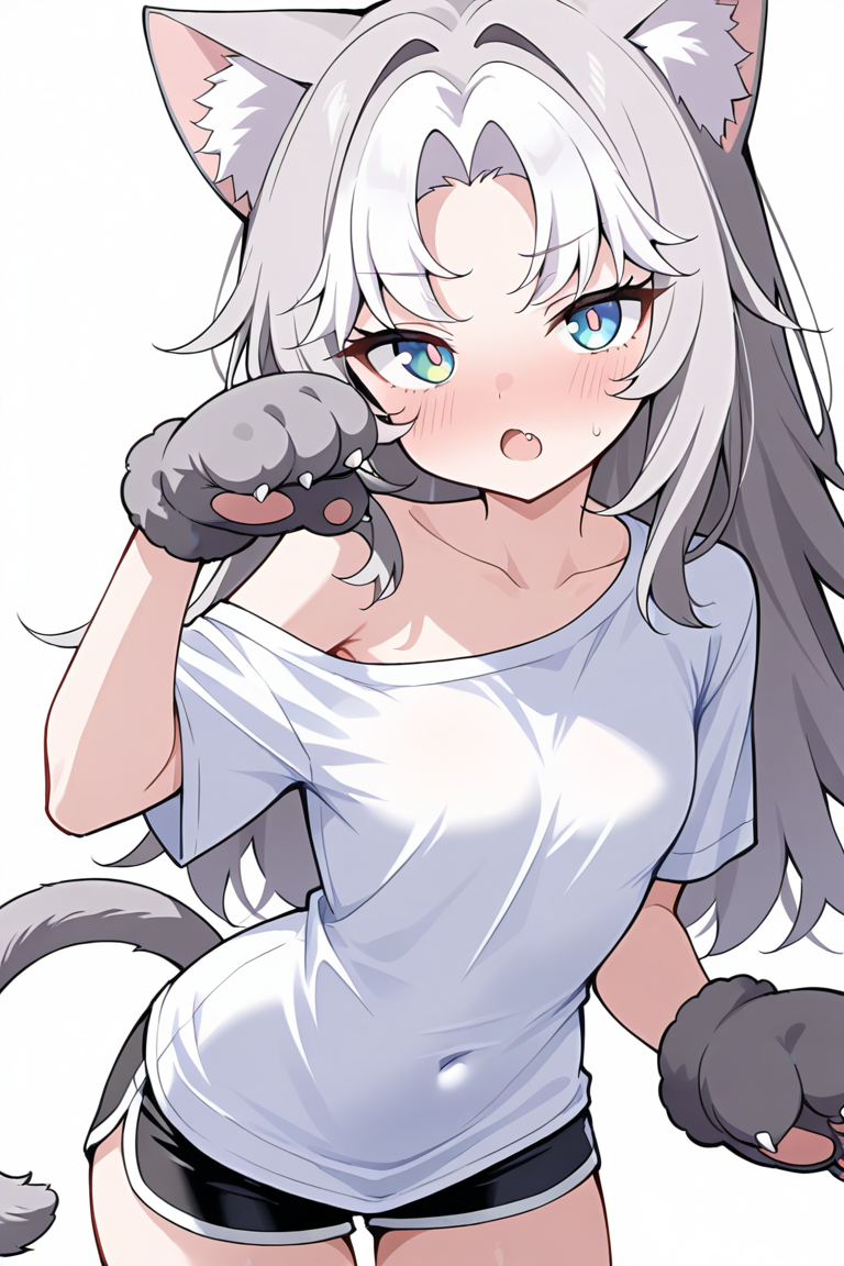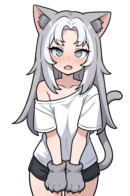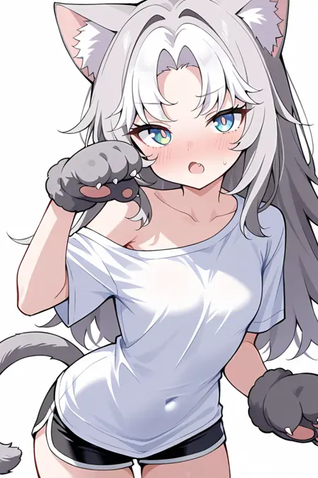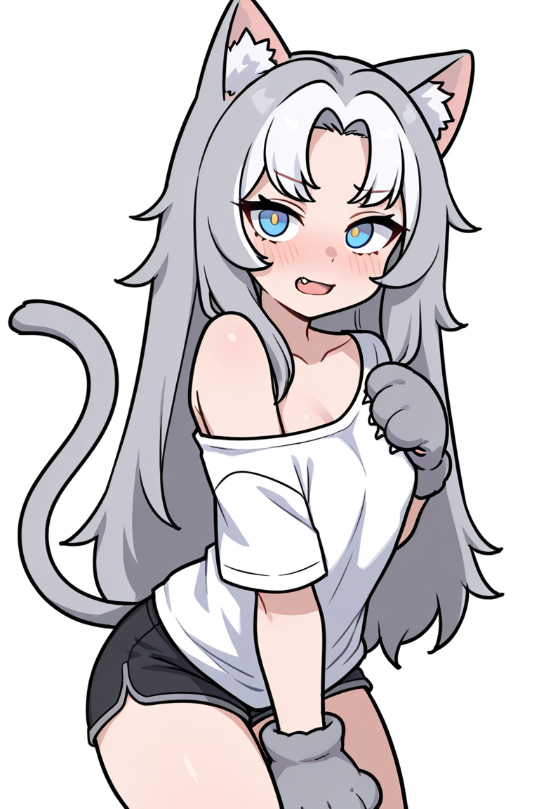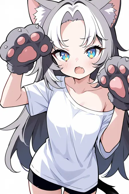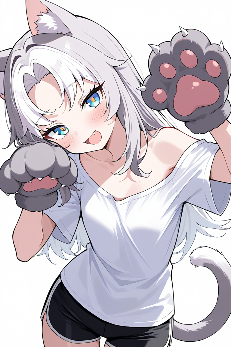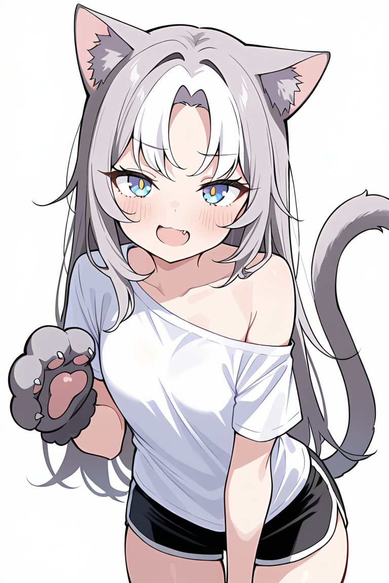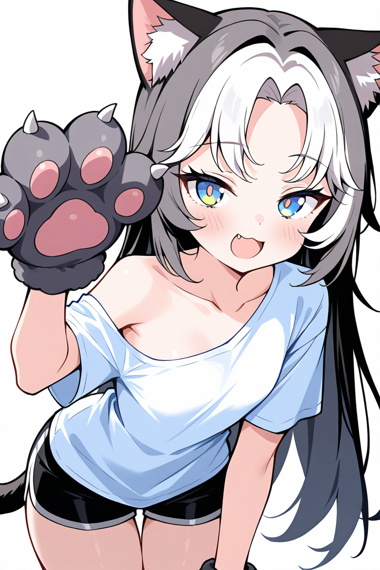提示词: Nabi-Cat,1名女孩,长发,灰发,多色发,白发,蓝眼,黄瞳,白衬衫,短袖,虎牙,刘海,动物耳朵绒毛,猫耳,猫尾,黑色短裤,露肩,毛皮镶边,爪套,灰色爪套