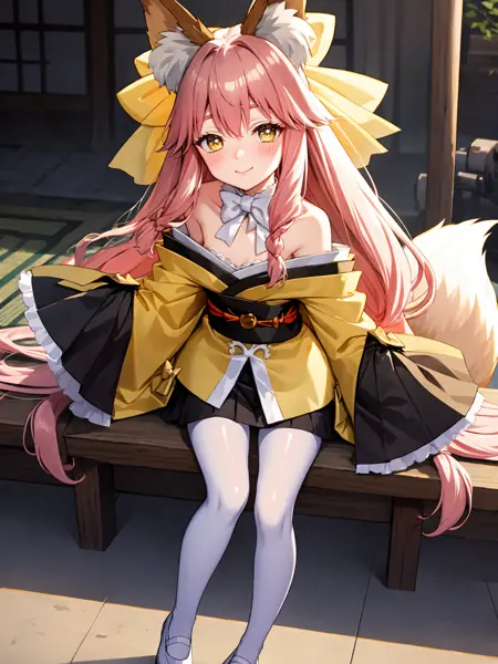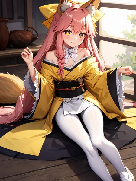 Tamamo Aria, fox ears, fox tail, yellow hair bow, yellow kimono, japanese clothes, long sleeves, sleeves past wrists, wide sleeves, white bow, bare shoulders, white pantyhose, obi, ribbon, white footwear