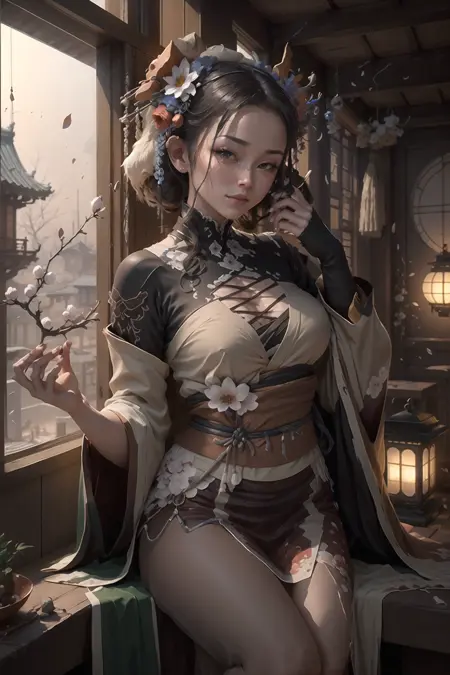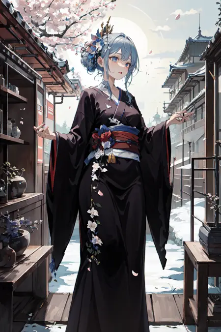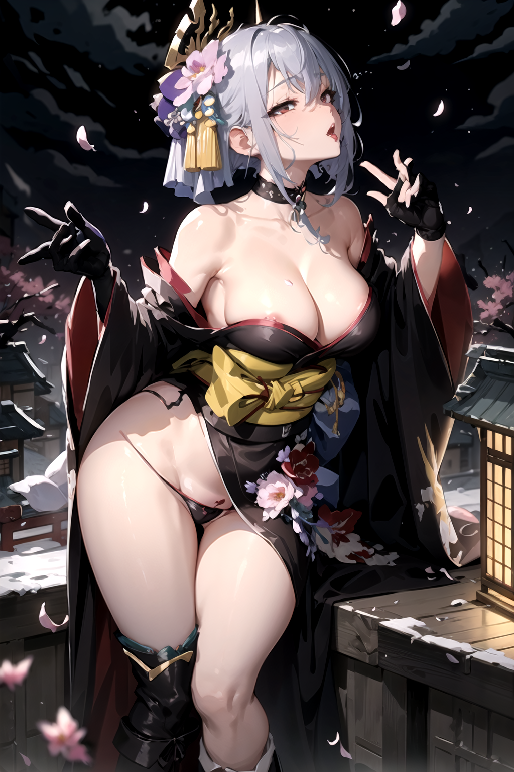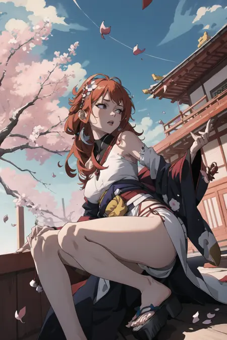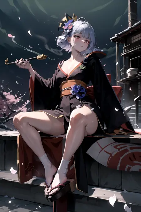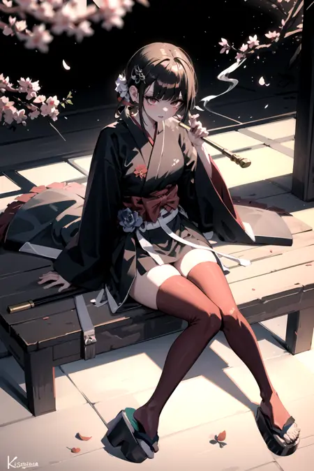geta, side slit, umbrella, smoking pipe, kiseru, katana, petals, falling petals, folded fan, hand fan, off shoulder, bare legs, japanese_clothes, kimono, gloves, cleavage, fingerless_gloves, hair_ornament, earrings, jewelry, makeup, sash, obi, lipstick, red_lips, hair_stick, hair_flower, flower, black_choker, choker, sarashi, white_kimono, thigh_strap, nail_polish, long_sleeves, bow, print_kimono, pink_kimono, yukata, short_kimono, red_kimono, thighhighs, underwear, white_panties, tabi, panties, bridal_gauntlets, black_kimono, black_hairband, sandals, blue_kimono, frills, wide_sleeves, blue_headwear, adapted_costume, see-through, dress, ribbon - A list of common tags in the dataset.