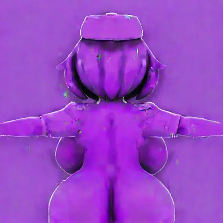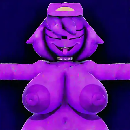WendyAfton(Illustrate), Purple Body, Purple Skin, Medium Hair, Purple Hair, Black sclera, white pupils,smiling,3D,3D Model,Security Guard Outfit, Security Guard Hat, Purple Clothes, Purple Clothing