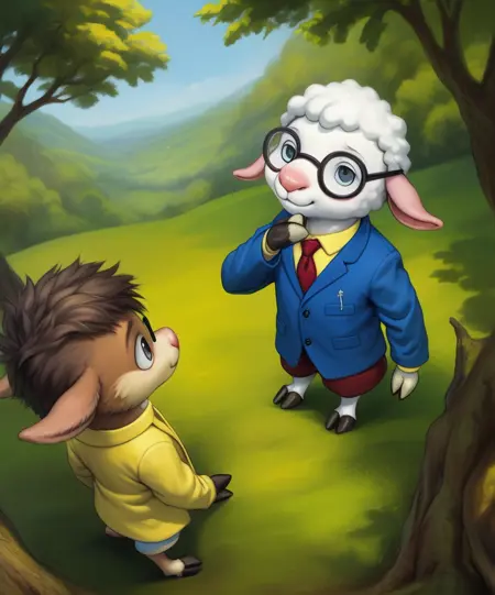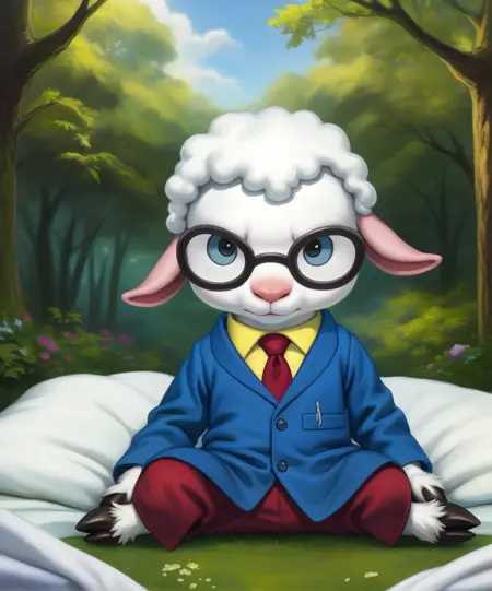 EuclidLlamaLlama1, sheep, white fur, pink ears, hooves, blue sclera, black eyes, glasses, yellow shirt, jacket, red tie, red shorts, chibi,