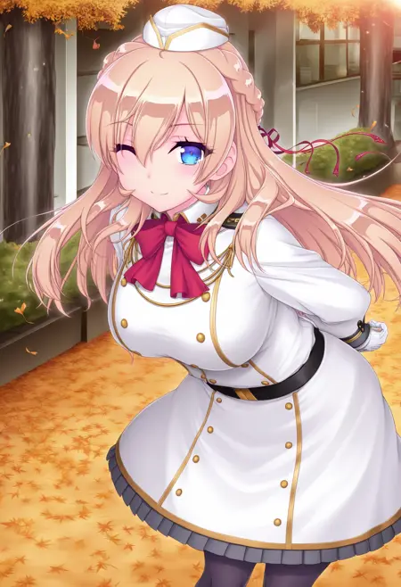 服装: 白色头饰, 白色制服, 长袖, 黑色腰带, 白色裙子, 黑色丝袜, 白色手套,